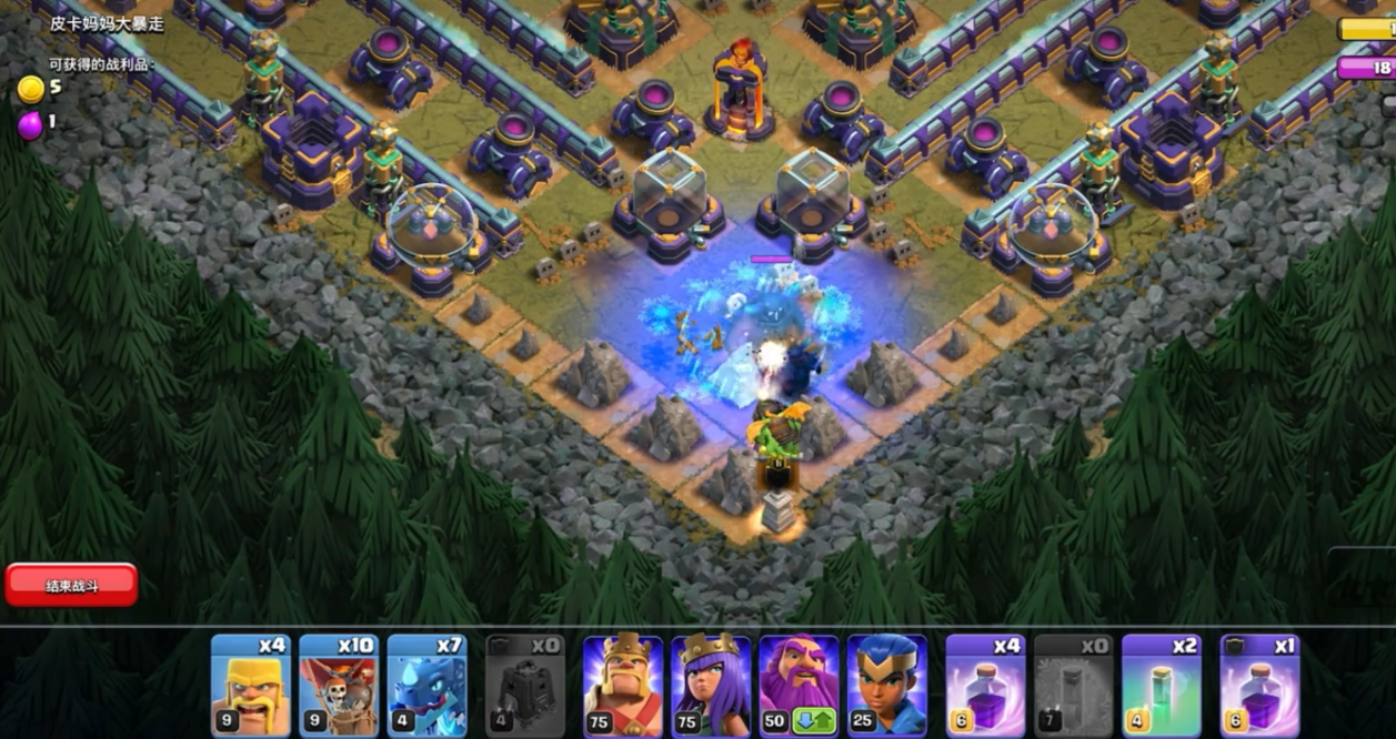 实战部署必须集群投放,单次至少10个巨人,避免单个投放被集火秒杀,利用攻击防御建筑的特性,优先吸引迫击炮、法师塔等溅射防御火力。进攻时先放少量巨人探路触发隐形弹簧、巨型炸弹等陷阱,确认安全后主力巨人跟进,搭配炸弹人或超级炸弹人破墙,超级炸弹人破墙效率更高,能快速打通巨人推进路径。面对密集阵型,采用三点式投放,主攻点放多数巨人,两侧分少量巨人清边,防止大部队跑偏,进入核心区域后,及时释放治疗法术抵消法师塔、迫击炮的持续伤害,狂暴法术提升拆塔速度,遇到防空火箭外置阵型,优先用巨人吸引火力,配合雷电法术摧毁防空,为天使治疗创造条件。