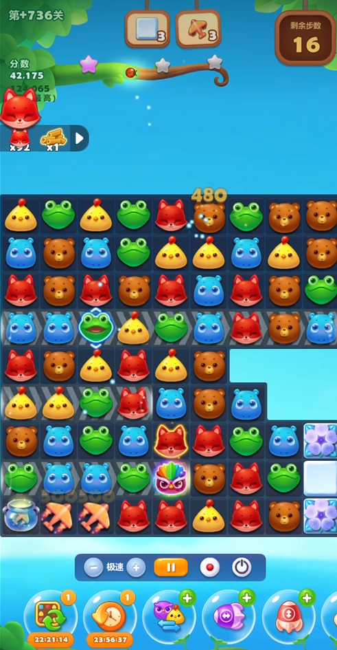 隐藏734关单靠普通消除无法在有限步数内完成收集,特效组合是通关的核心关键。成功激活彩虹猫头鹰后,要持续在中上部区域合成各类特效,企鹅与河马的刷新点主要集中在棋盘中上部,围绕该区域消除,更容易触发目标动物的连锁掉落。优先合成爆炸特效与直线特效,再将其与彩虹猫头鹰组合,彩虹猫头鹰搭配直线特效可清除整行整列障碍,搭配爆炸特效则能清除大范围同色元素,一次组合释放就能清理半屏障碍,同时带动大量企鹅与河马落入收集区域。过程中要避免分散消除,始终聚焦中上部目标区域,让消除与收集形成联动,减少无效步数消耗。