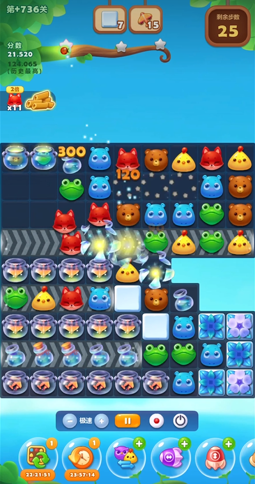 开心消消乐隐藏734关想要顺利通关,核心是快速激活中央彩虹猫头鹰打开局面,持续合成特效组合清理障碍并收集目标动物,精准把控步数分配,即可完成7只企鹅与5只河马的收集任务。