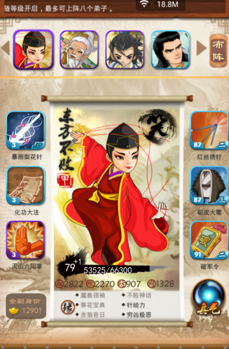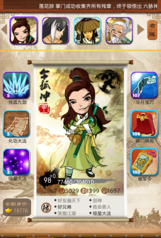 七甲阶段产出的弟子覆盖攻防控辅全类型,东方不败与上官金虹是核心输出,攻防成长优异,技能触发频率高,适配菜刀流阵容,能快速清场推图与血战。令狐冲与杨过兼具输出与生存,缘分体系完善,搭配对应甲级武功与装备后,可激活大量属性加成,实战能力全面。郭靖与天山童姥偏向防御与控制,郭靖能抗能打,自带团队防御增益,童姥技能附带控制效果,可有效限制敌方输出节奏。李秋水则是攻防均衡型弟子,适配多种阵容组合,能稳定提升队伍整体战力。这些弟子无需过度依赖高VIP等级,通过集市寻访、活动积累即可获取,是平民与小R玩家的核心战力支柱。