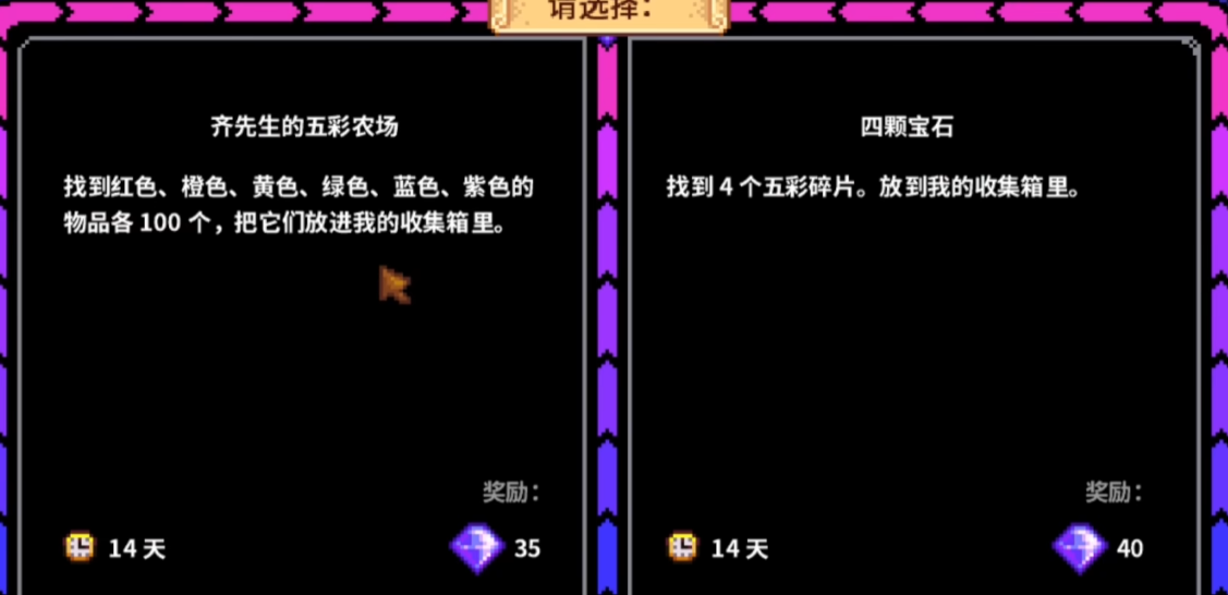 后续任务可能涉及收集五彩物品、挑战矿洞层数或完成特殊订单。建议提前储备各类资源,比如不同颜色的作物、矿石和鱼类。矿洞挑战可以准备楼梯和食物提升效率,而收集类任务则要规划好种植和采集路线。完成任务后会获得齐先生赌场的会员卡,解锁新区域和独特奖励。
