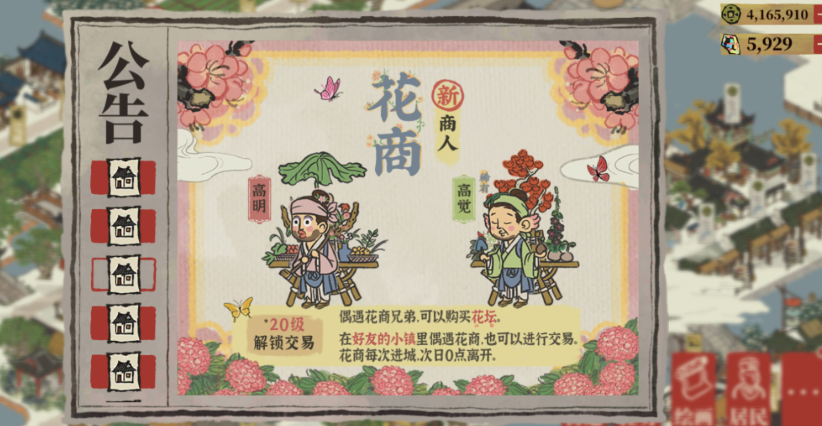 与花商交易时,玩家可以购买不同类型的花坛。花商分为高明和高觉两兄弟,高明出售普通花坛,高觉出售稀有花坛。购买花坛需要消耗游戏内的资源,如铜钱或其他物品,玩家可以根据自己的资源和需求来选择购买的花卉,避免盲目消费导致浪费。交易过程很简单,只需点击花商并选择想要购买的花坛即可完成,购买后花坛会自动存入仓库,玩家可以在营造界面中放置来装饰城市。这些花卉不仅能美化环境,还可能对城市繁荣产生积极效果。
