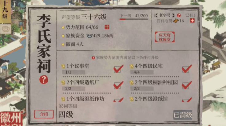 家祠的升级与势力范围的扩张构成了玩法的核心循环。家祠等级的提升依赖于在其当前势力范围内布置特定种类和等级的建筑,而势力范围的扩大则需要消耗由徽商贸易赚取的家族资金。声望等级则通过持续的贸易活动积累,它决定了势力范围扩张的上限,与家祠等级形成相互促进的关系。