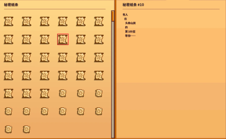 秘密纸条10的获得方法,是前往位于沙漠的骷髅洞穴(也称沙漠矿洞),一路深入到第100层,到达后会自动触发与齐先生的特殊剧情,完成后即可获得秘密纸条10,同时还能得到一瓶能永久增加25点生命值的特殊奶汁作为奖励。在开始这个挑战前,你需要确保自
