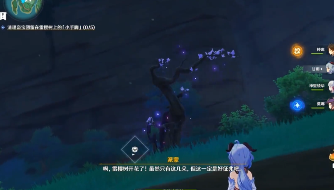 首先找到五棵雷樱树的位置,并通过元素视野引导落雷清除异常点。每棵雷樱树周围有三个蓝色磁场,玩家需要站在磁场内引导雷樱树的落雷击中这些区域,从而消除异常。完成清理后,需从树干上取出异物,雷樱树即可恢复健康。第一棵雷樱树位于九条阵屋传送点北边的